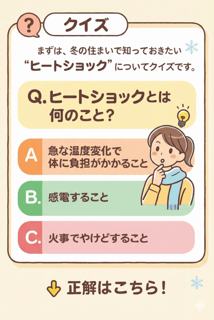 まずは、冬の住まいでよく話題に上がる “ヒートショック” について、簡単なクイズです。