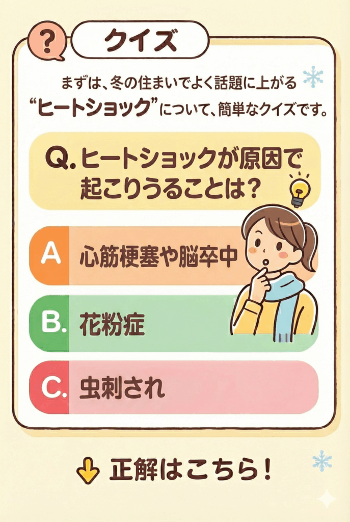 今回は、その温度差に関係する「ヒートショック」についてのクイズです。
